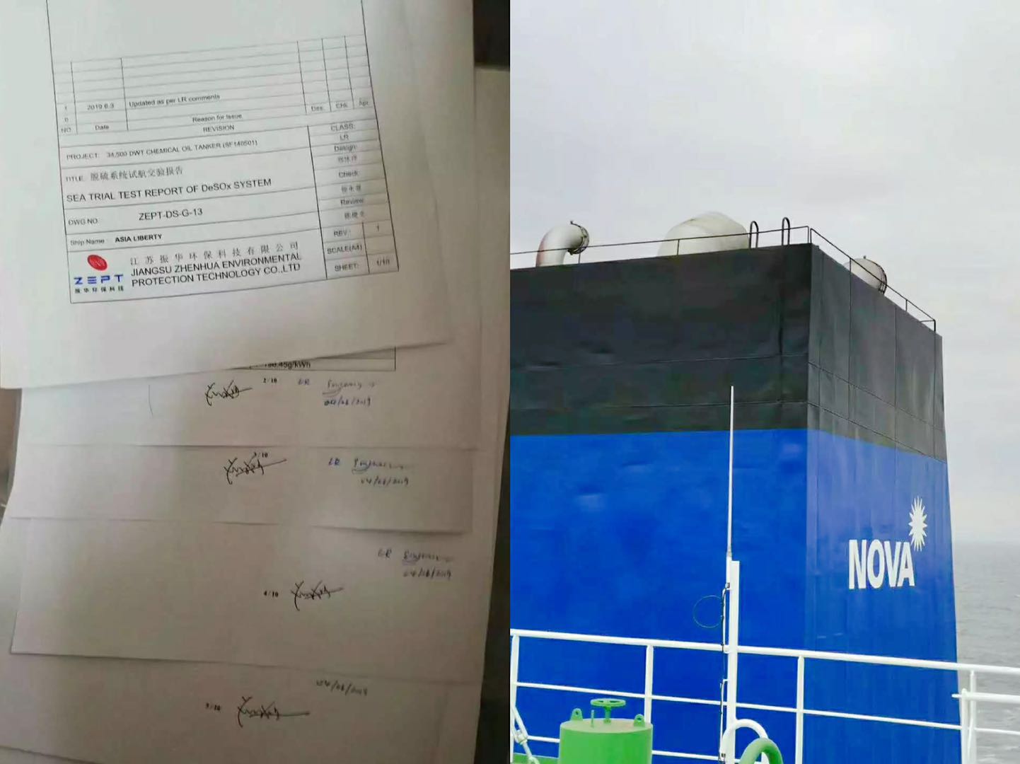 江苏振华环保科技有限公司(ZEPT)为新加坡“NOVA CARRIER SINGAPORE”公司34500DWT化学品船配套的船舶废气洗涤系统,已于2019年6月4日圆满完成试航任务,顺利回归,各项指标均满足IMO公约要求,得到客户及船级社认可。