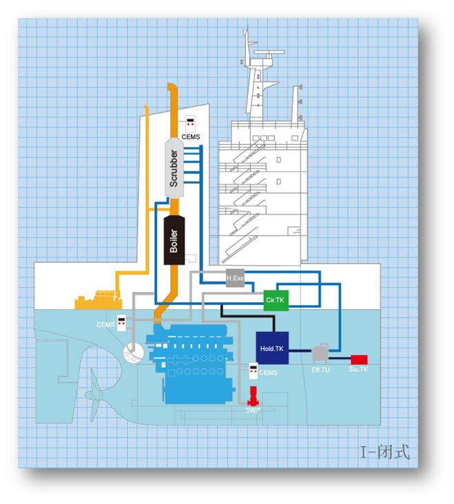 In a closed loop scrubber system, the exhaust gas enters the scrubber and is sprayed with water that has been mixed with NaOH. The sulphur oxides in the exhaust react with the mixture and are neutralized. The bleed-off washing water is treated to fulfil IMO requirements and can be safely discharged overboard with harmless to the environment.